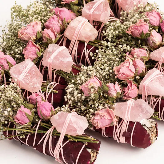 4" SELF LOVE Dried Floral Sage Wand - Rose Quartz and Rose