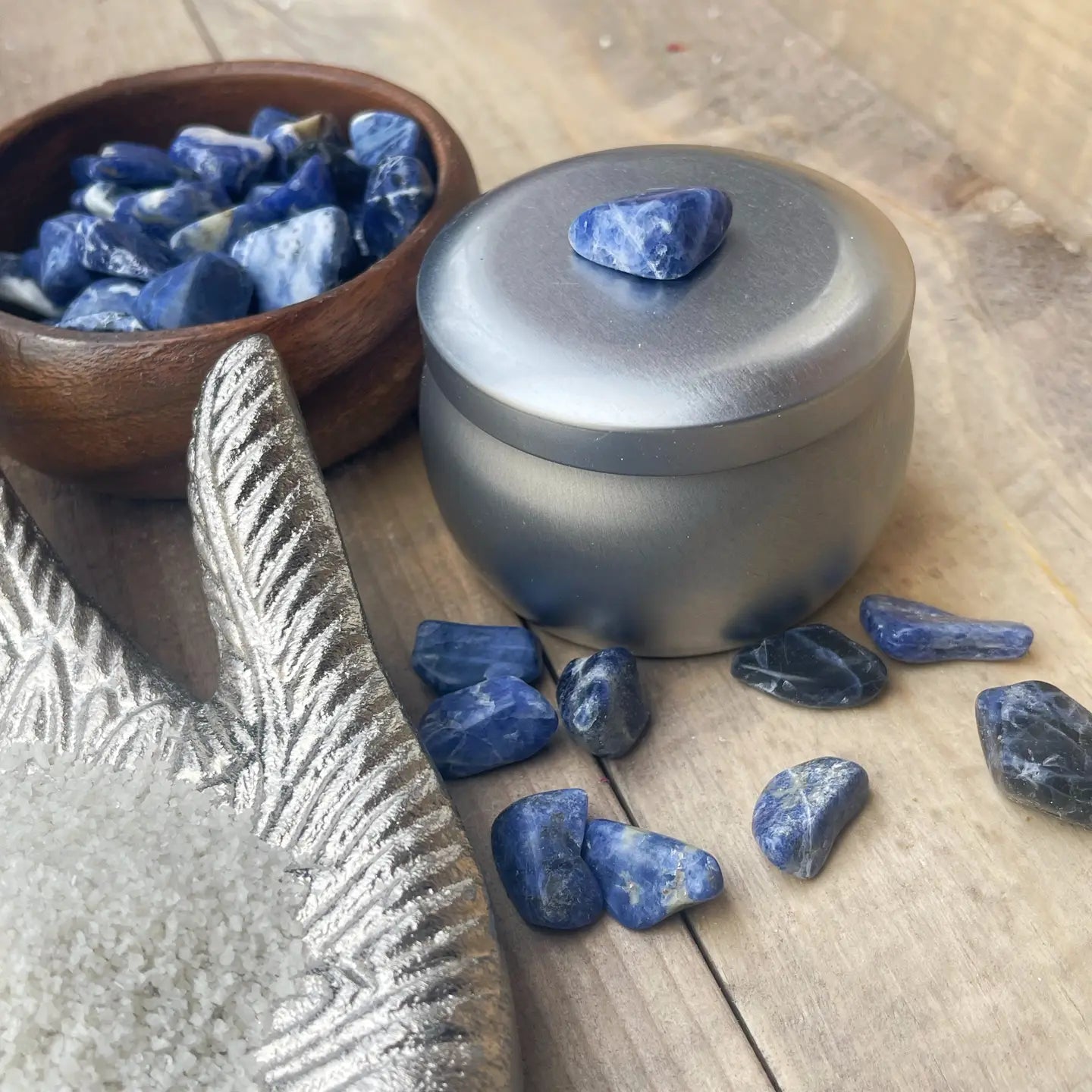 Sel gris salt is included for its purifying properties and tumbled sodalite for its association with confidence, self-expression, and mental clarity. As the flame dances above the tranquil blue depths of sodalite, feel its uplifting energy infuse your space with a renewed sense of purpose and determination.